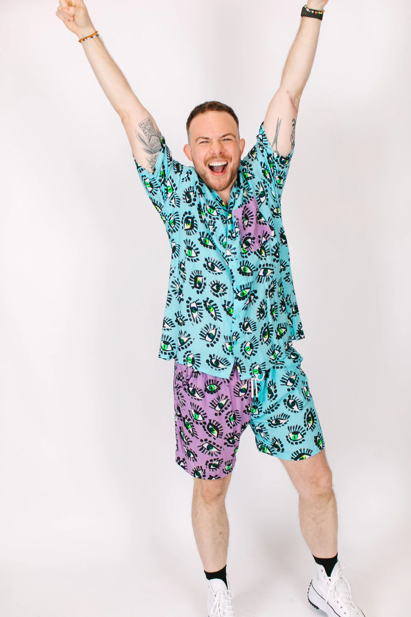 Get ready for the summer set of your daddy dreams. This fun button-down shirt is statement-making and will be sure to turn heads. Made in a comfortable, breathable fabric it is lightweight but not light on style. The custom fabric ensures you will stand out in a crowd. This is not your dad's button down shirt, it's your daddy's button down shirt. Looking for a more cropped style? Check out our Baddie button-down.