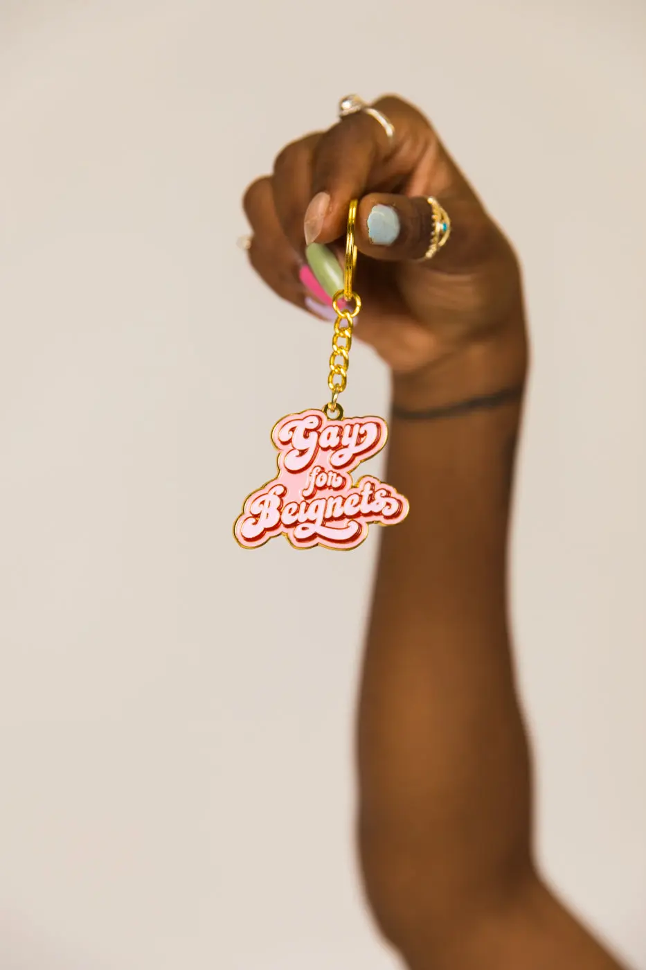 Gay for Beignets soft enamel keychain. Gold plating.
