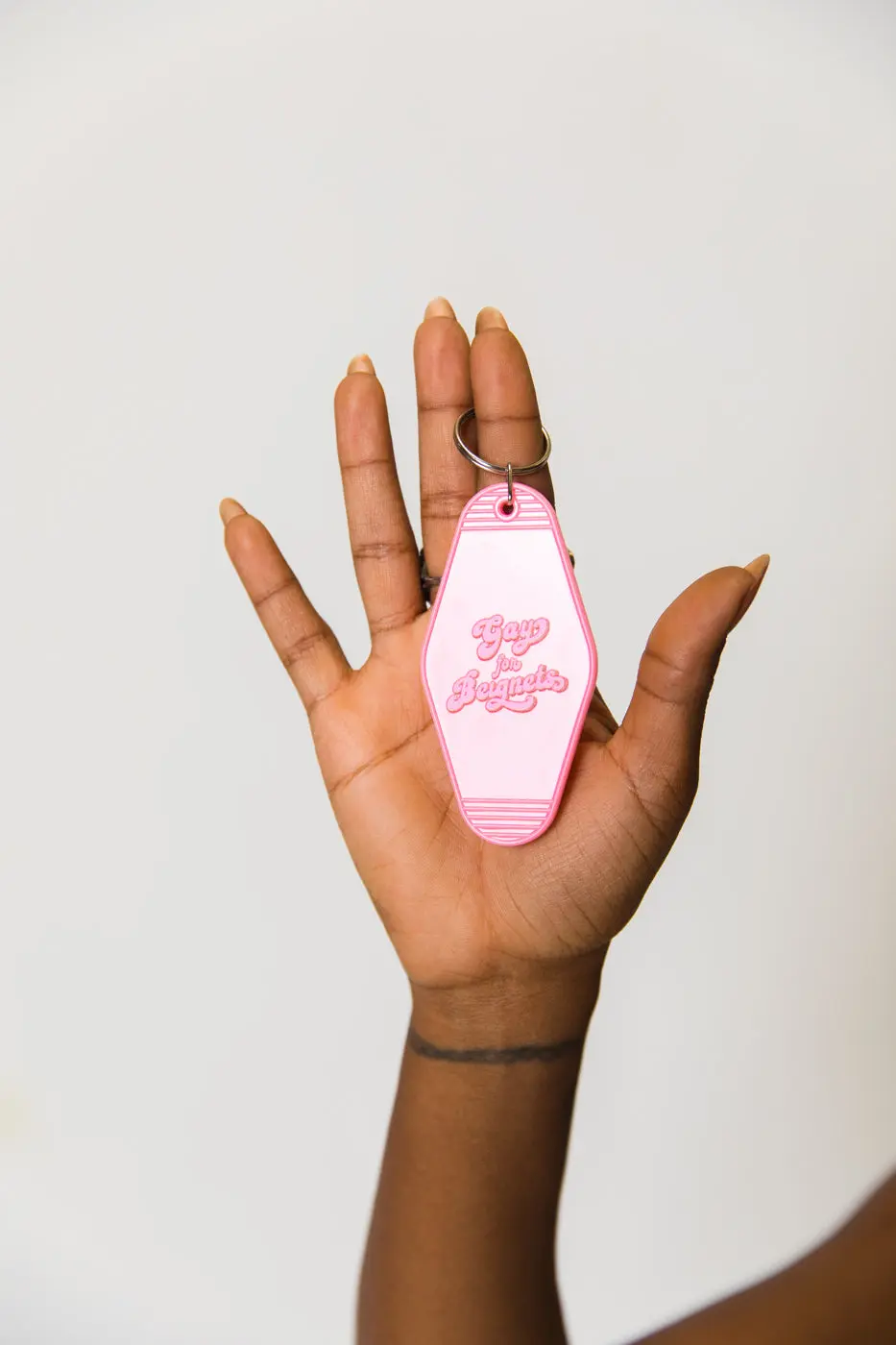 Gay for Beignets Pink Motel Keychain. Speak with your keys and let everyone know how you truly feel about beignets.