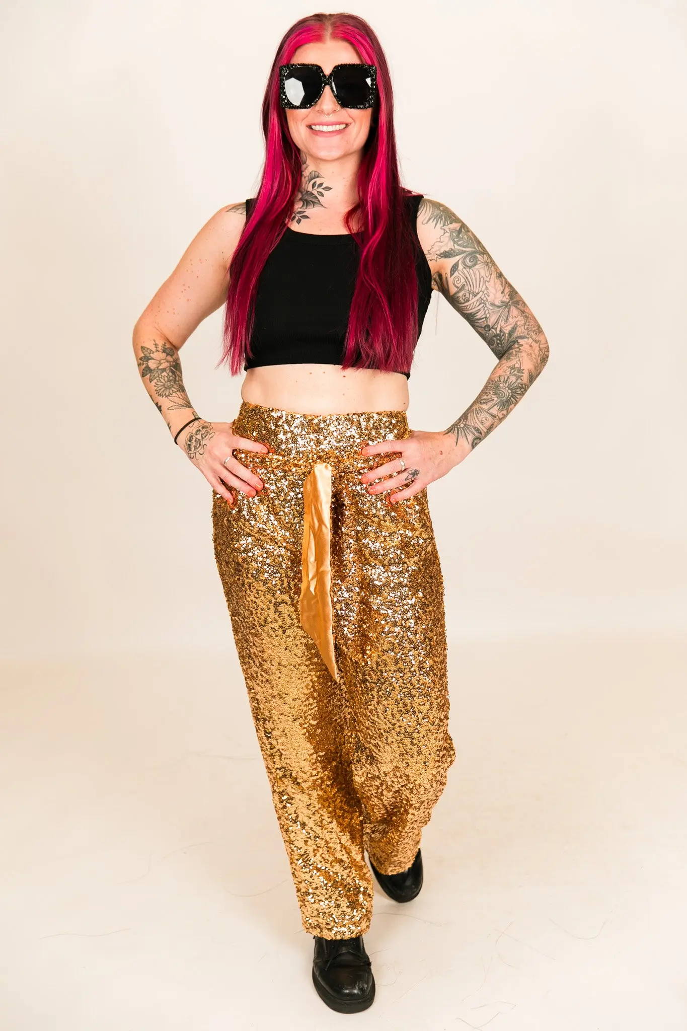 Our party pant - GOLD high waisted sequin pant with front satin tie. Jersey lined for amazing comfort. It's like a party loungewear.
