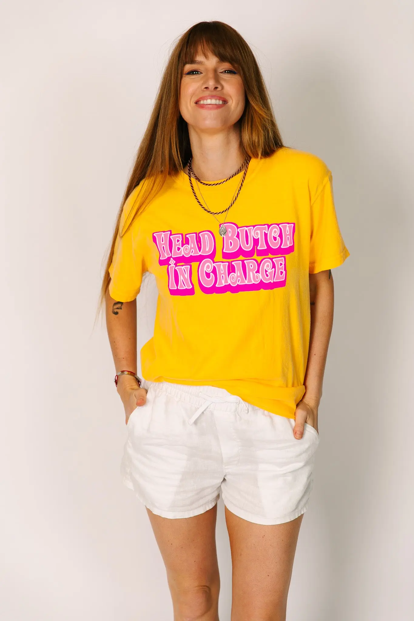 "Head Butch In Charge" screen-printed yellow shirt. Let everyone know who is really in charge with this fun shirt.