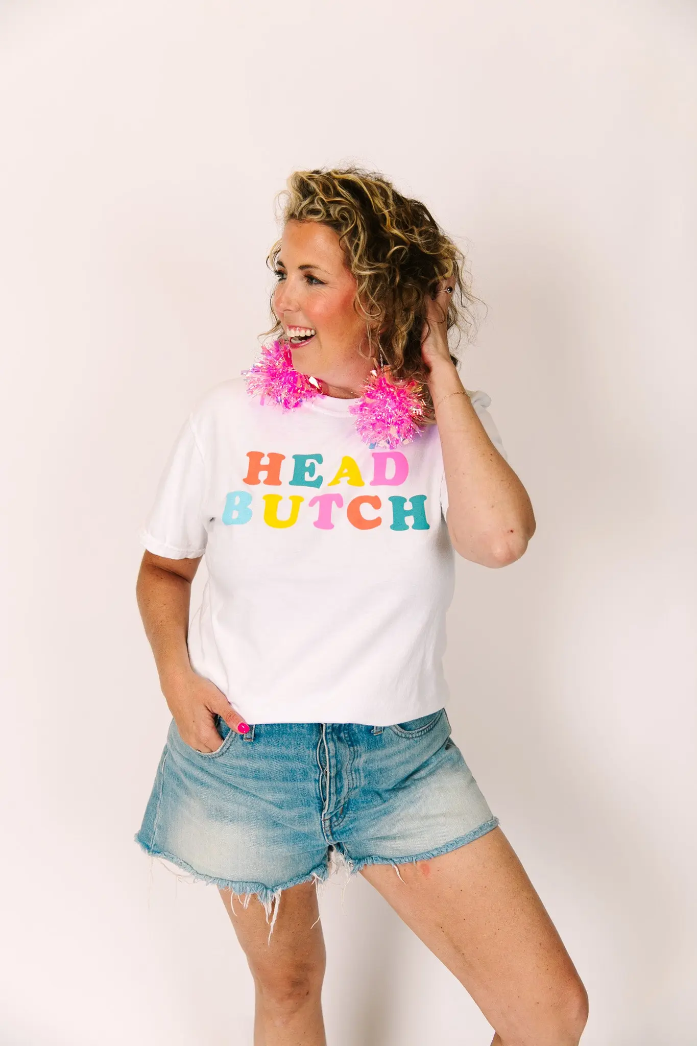 "Head Butch" screen-printed white shirt. Let the people know who the Head Butch really is with this fun and colorful shirt.