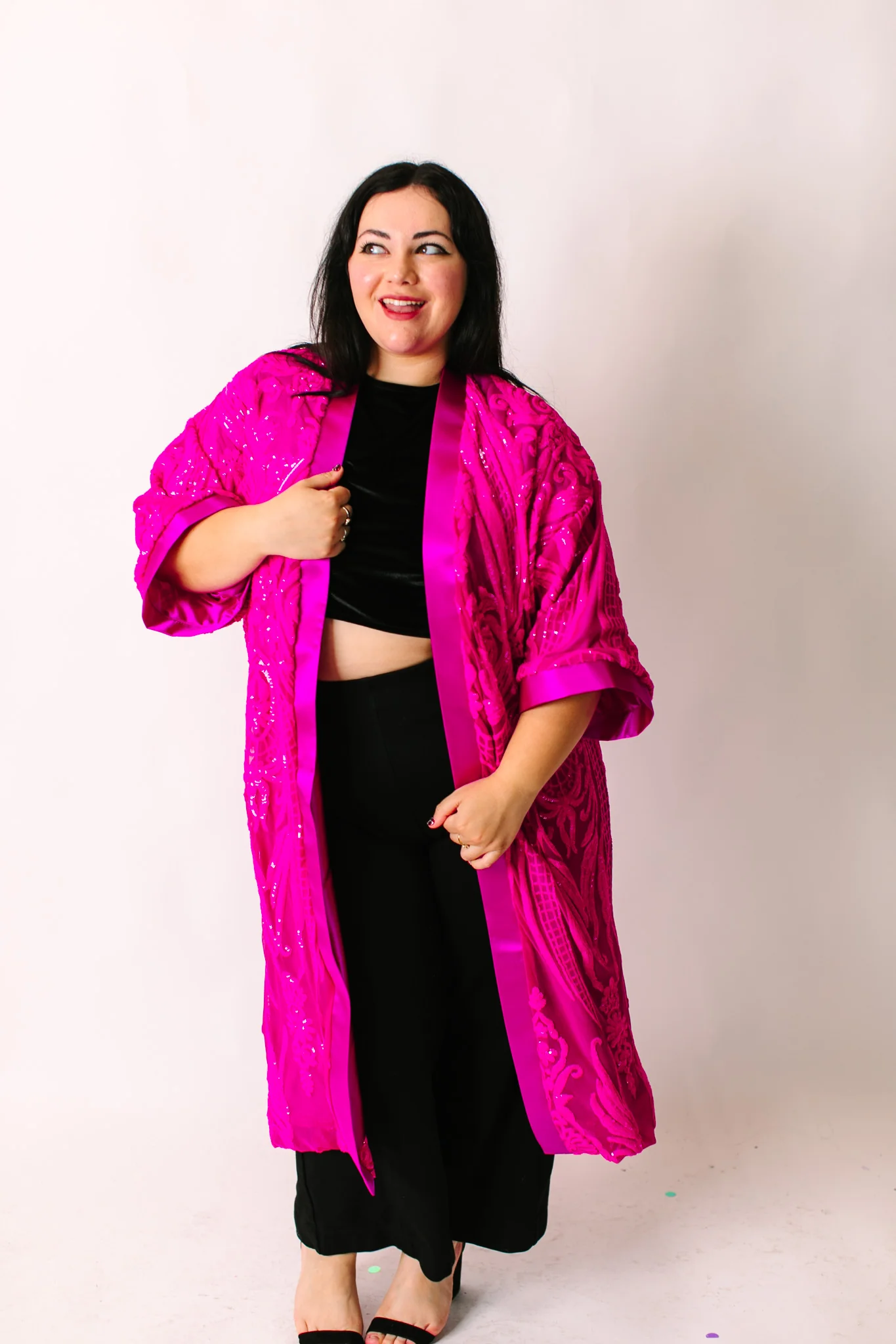Introducing the ultimate statement piece for your wardrobe - our dazzling sequin duster jacket! Perfect for adding a touch of glamour to any outfit, this jacket features sparkling sequins that will catch the light and turn heads. Whether you're hitting the dance floor or adding some sparkle to your everyday look, this jacket is sure to make you feel like the life of the party. With a flowy fit and satin lining it's perfect for layering over your favorite outfit. Get ready to shine in our sequin duster jacket